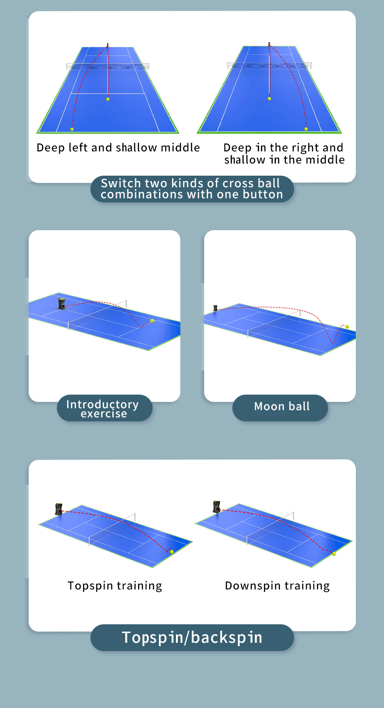 - Serve Speed: 20-120 km/h, frequency 1.8-8s/ball (adjustable via app)